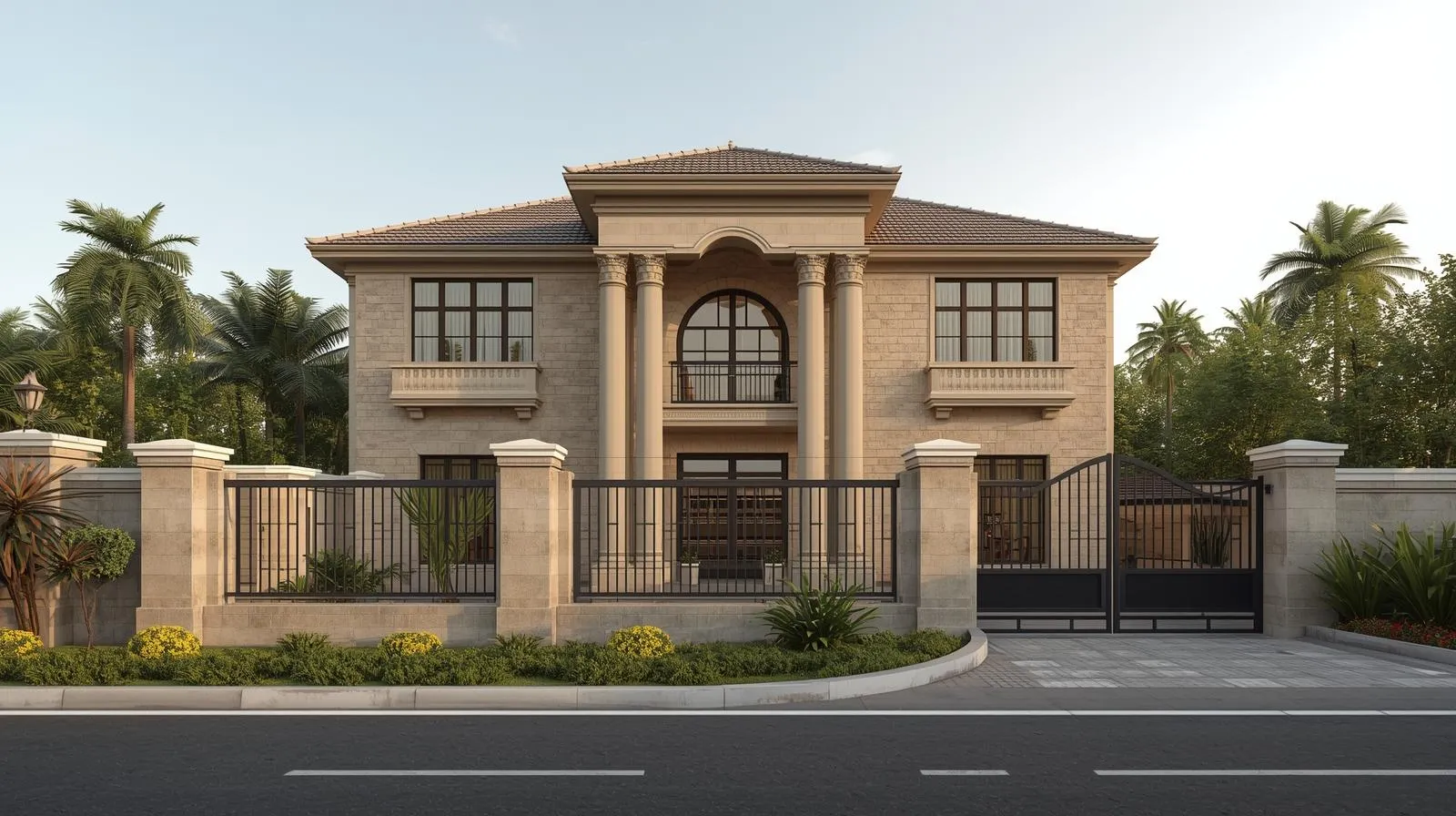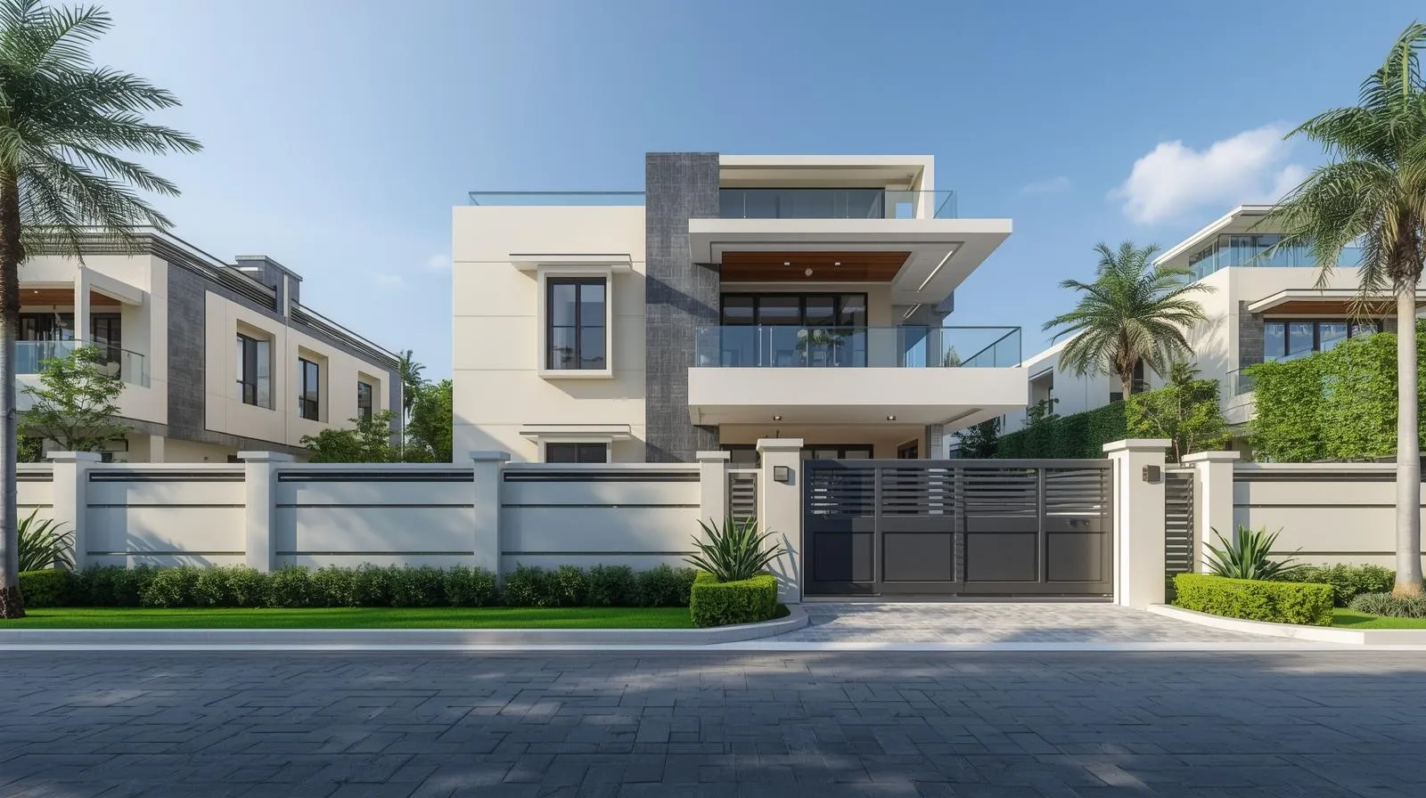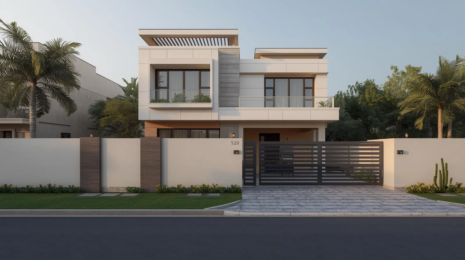 Highlights: Modern elevation, glass balcony, wide driveway, bright natural light
